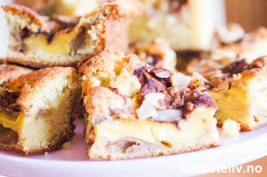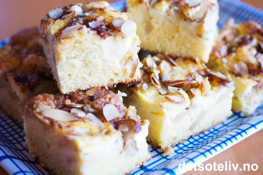 Se også oppskrift på "Eplebiter med vaniljekrem" her på Det søte liv, som er en lignende kake beregnet på liten langpanne. En annen super kake er "Eplekake med vaniljekrem" som er stekes i rund form.