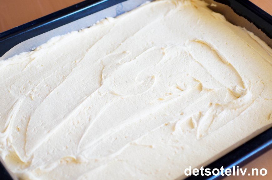 Fordel deigen jevnt utover i en stor, bakepapirkledd langpanne (ca 30x40 cm).