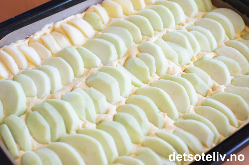 Skrell eplene og del i skiver. Legg epleskivene i pent mønster oppå deigen.