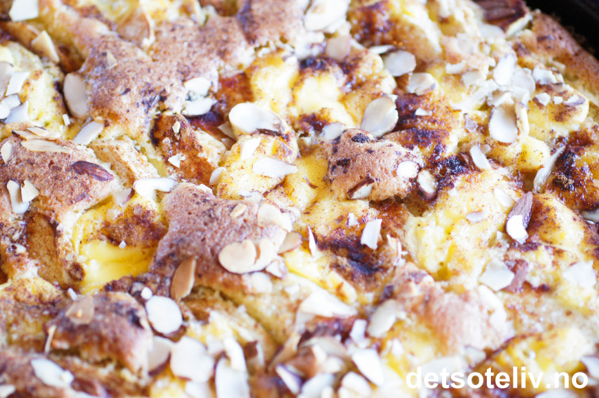 Æ tok meg friheten og forandra litt på rekkefølgen. Hadde vaniljekrem oppå røra i panna, eplebåtene dynket jeg i kanel og sukker og dytta de tett i tett nedi. Så mandlene oppå og la smør skiver på toppen.( tynne osteskiver med ostehøvel av kald smør eller margarin).