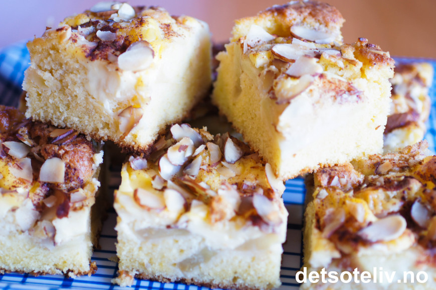 Fordel deigen jevnt utover i en stor, bakepapirkledd langpanne (ca 30x40 cm). Skrell eplene og del i skiver. Legg epleskivene i pent mønster oppå deigen. Legg vaniljekremen over eplene i små klatter ved hjelp av en spiseskje. Dryss over sukker, kanel og mandelflarn (mandlene kan sløyfes hvis du vil).