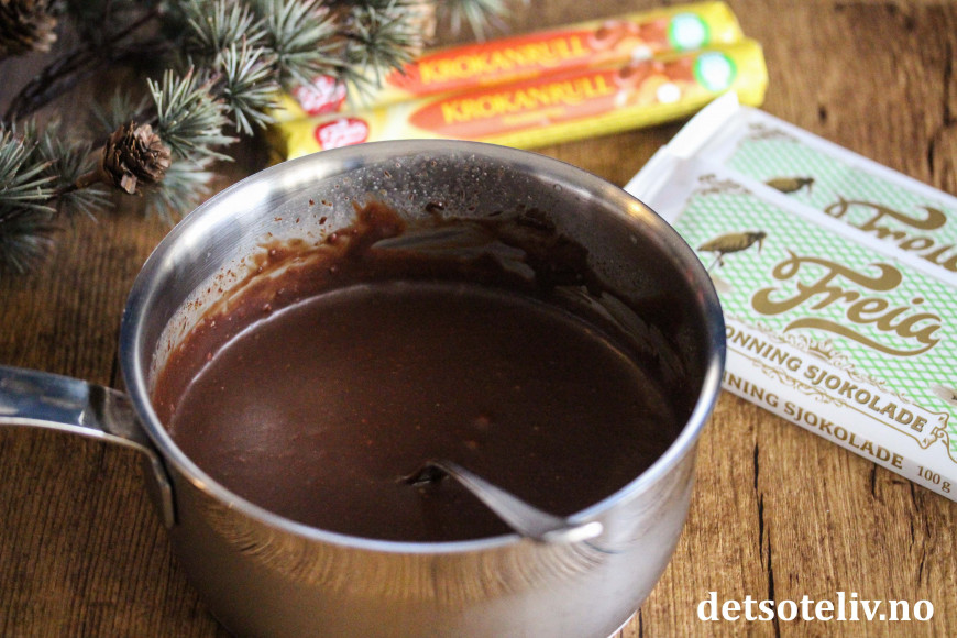 Del sjokoladen i biter og ha bitene i kjelen med den varme fløten. La sjokoladen smelte i den varme fløten på svak varme og rør blandingen jevn.