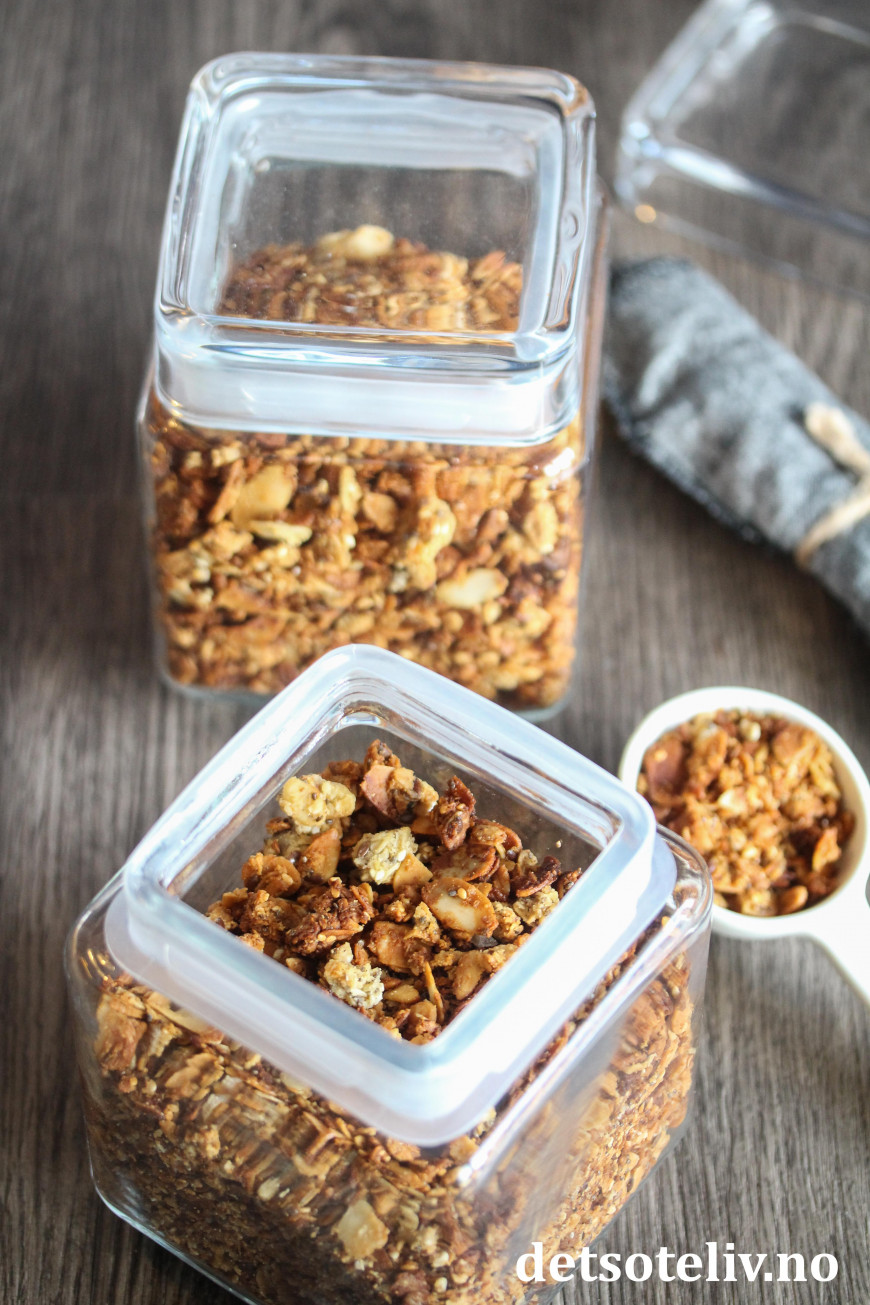 ♥ Denne oppskriften er ikke vegansk siden jeg bruker både melk, smør og honning. Du kan alternativt bruke mandelmelk og kokosolje og erstatte honning med mer lønnesirup eller bruke agavesirup for å få granolaen vegansk.
