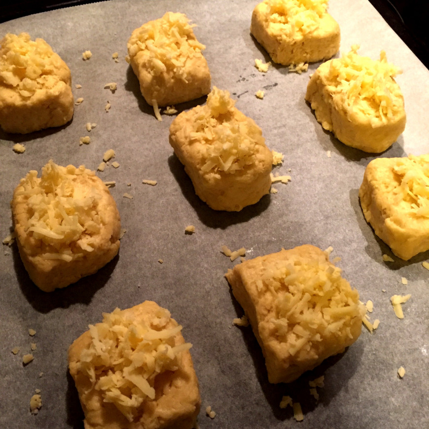 Riv litt mer ost og dryss dette på toppen av hver scones, i tillegg til evtl et lite dryss maldonsalt.