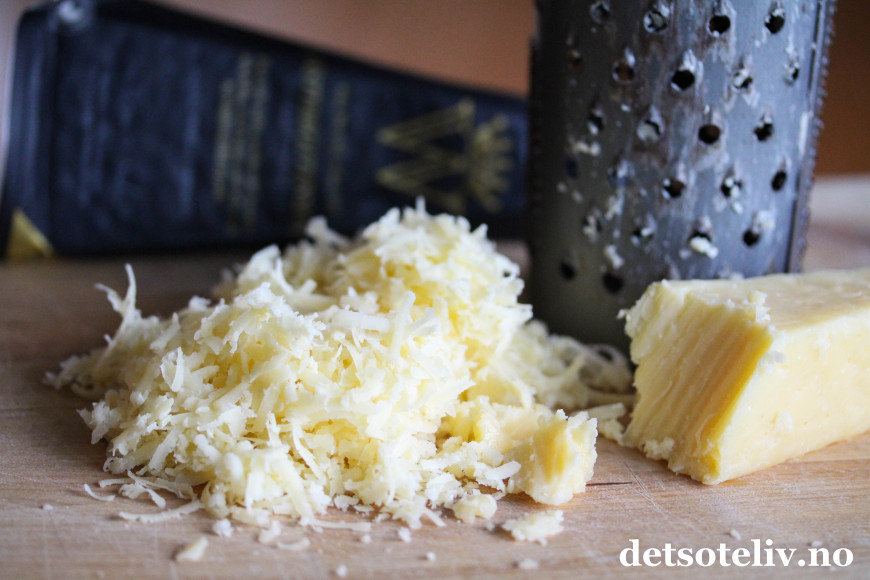 Vips sammen egg og melk i en annen bolle. Riv osten på rivjern.