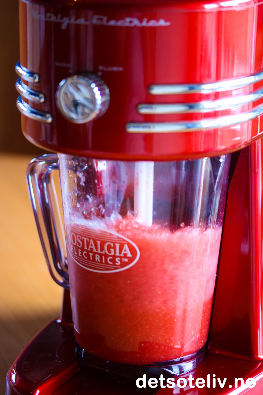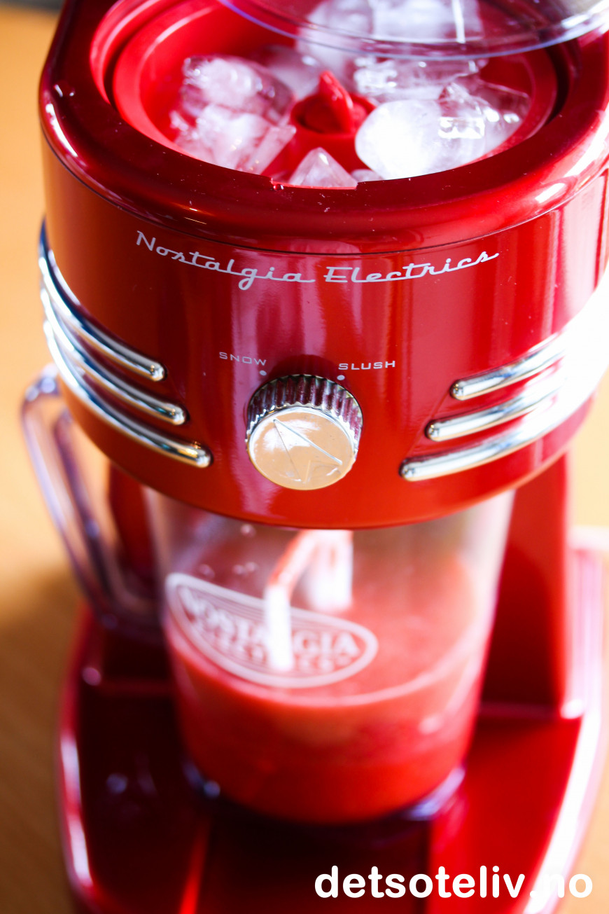 Jeg anbefaler alle å anskaffe seg en slushmaskin! En slushmaskin høvler isbiter til flak slik at du kan lage forfriskende slush av all slags drikke. Det er uendelig med muligheter for å lage drinker, enten med eller uten alkohol.