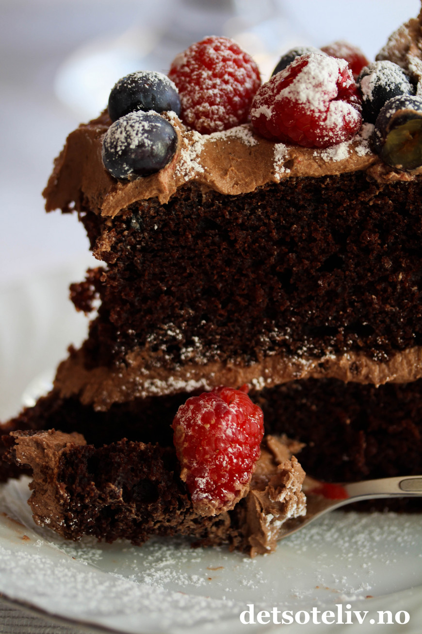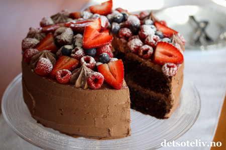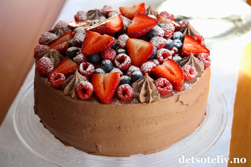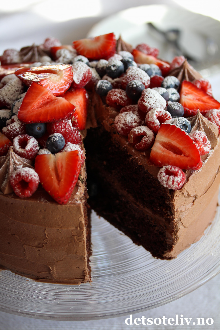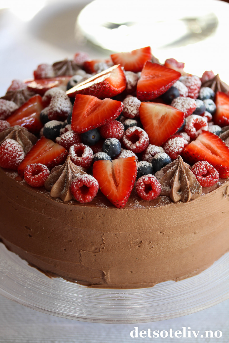 Saftig deilig sjokoladekake med masse friske, søte bær