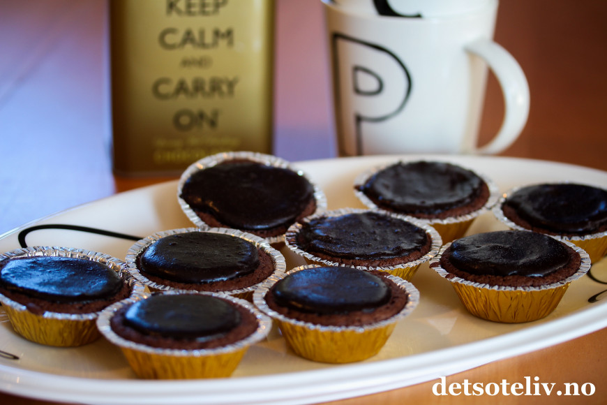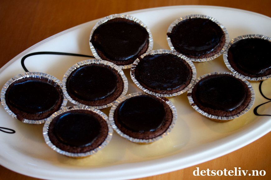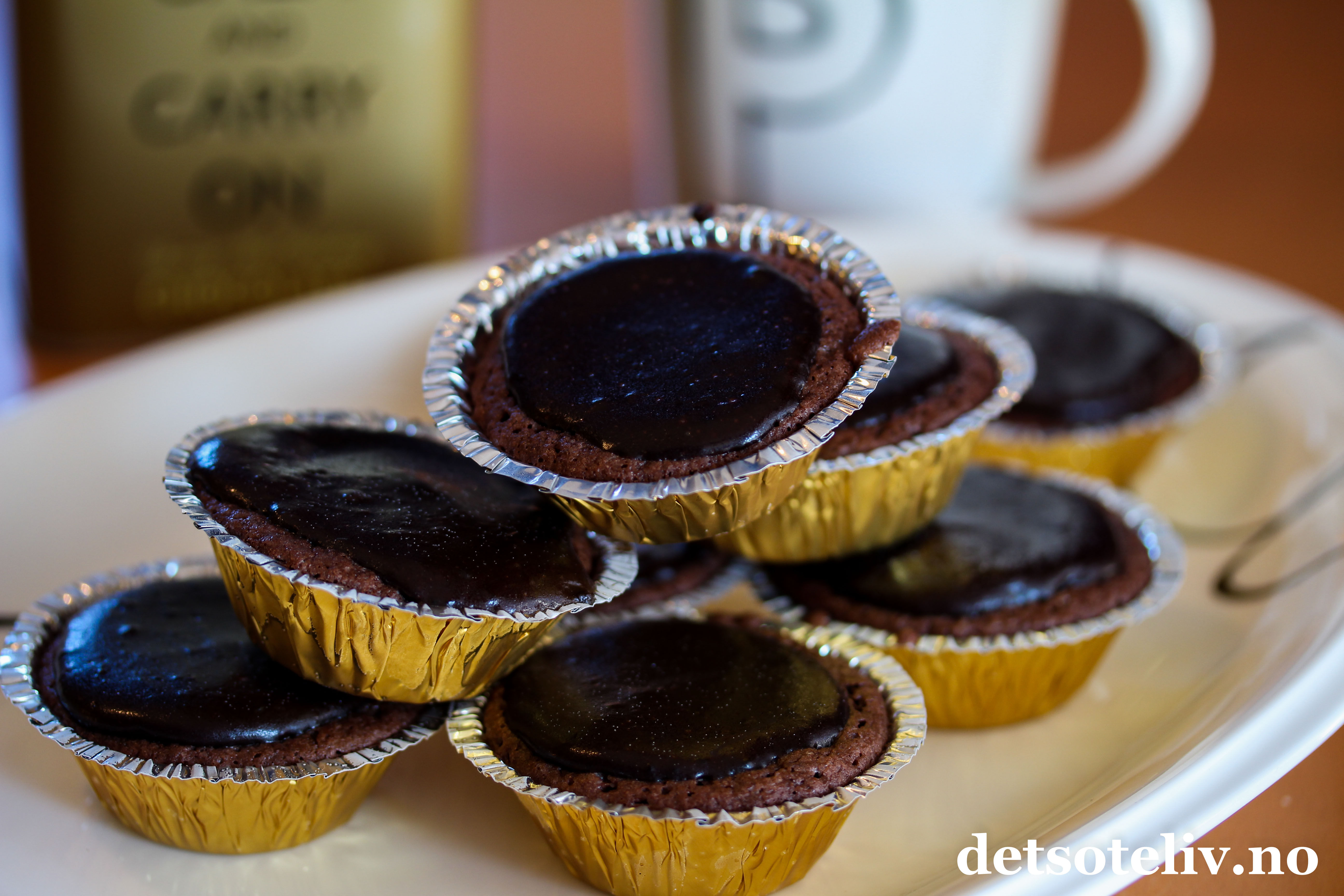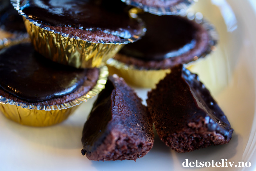 Stek muffinsene midt i ovnen ved 160°C i 15 minutter. De vil da fortsatt virke litt bløte i midten, og det er slik de skal være. La muffinsene bli helt kalde før du har på sjokoladeglasuren. De vil da synke litt sammen i midten slik at det danner seg en grop i hver muffins.