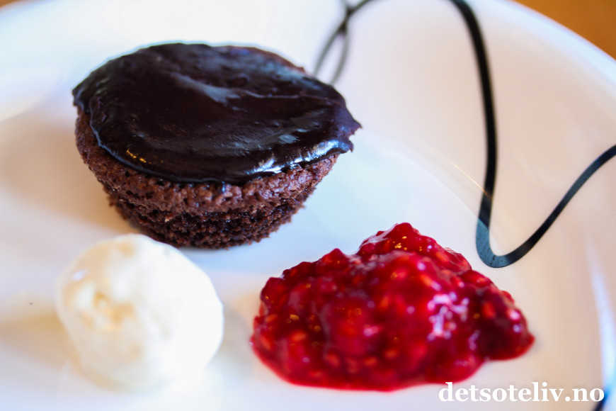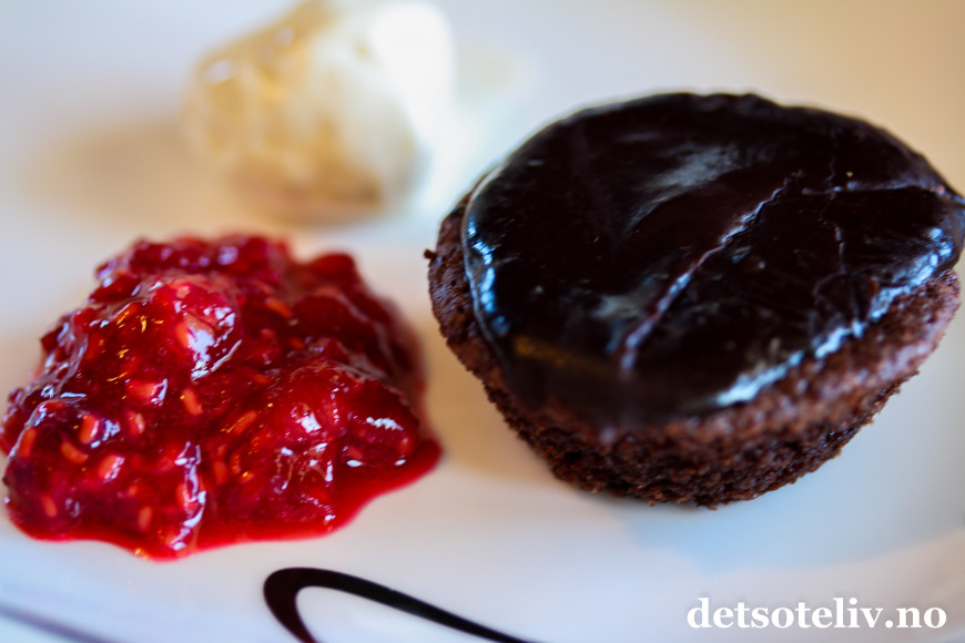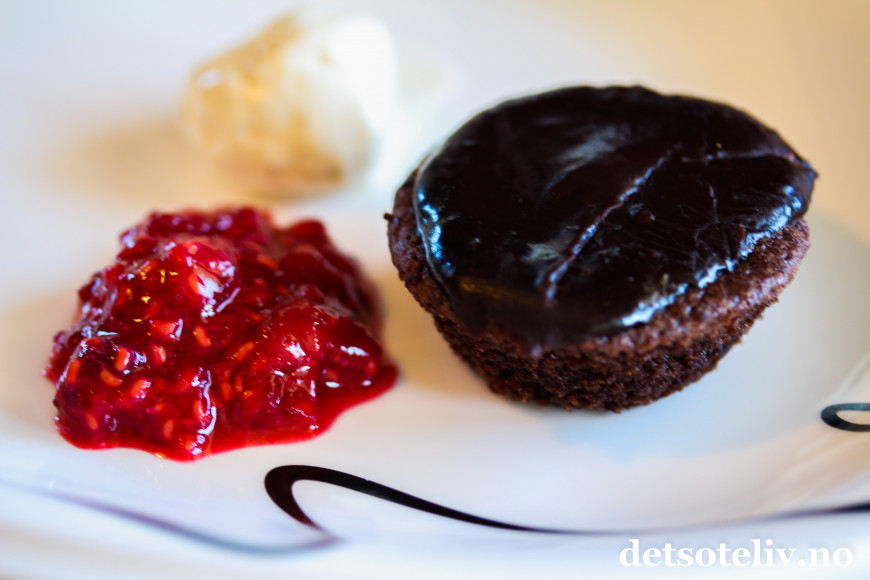 Konfektmuffinsene smaker fantastisk sammen med en liten kule vaniljeiskrem og rørte bringebær.