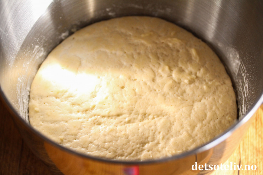 Elt deigen i ca. 5 minutter i kjøkkenmaskin med eltekrok. Deigen skal være temmelig løs i konsistensen.