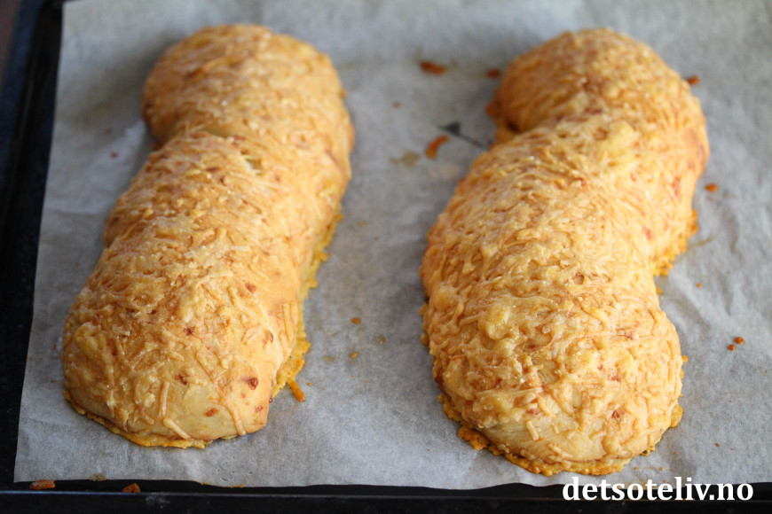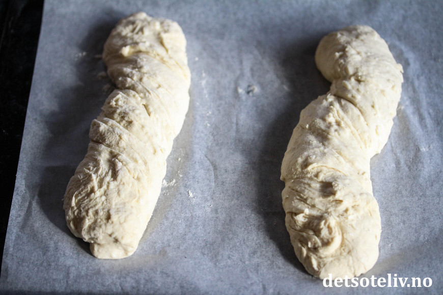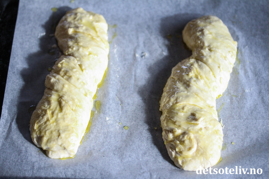 Ha litt olje på hendene når du tar i deigen. Del deigen raskt i to deler, og form dem til små, avlange brød som tvinnes lett, og legges på bakeplaten. Det er bare sjarmerende dersom brødene blir litt skjeve.