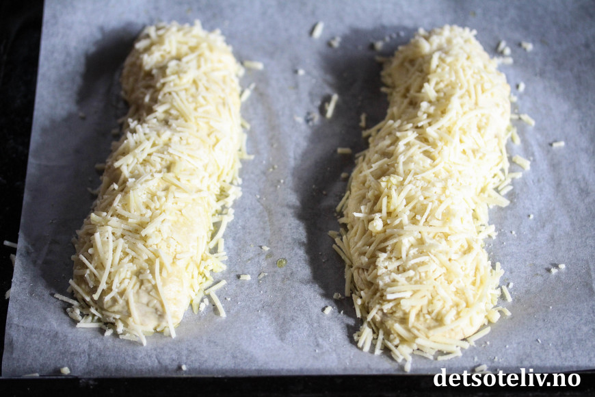 Pensle over brødene med olivenolje og dekk dem med masse ferskrevet parmesanost. Press osten godt inn langs sidene og på toppen av brødene.