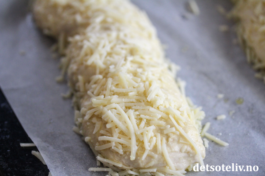 Parmesanbrødene inneholder både revet parmesan i deigen og på toppen.