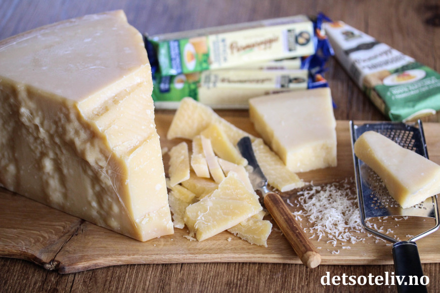 Jeg bruker parmesanosten Parmigiano Reggiano som produseres av Parmareggio. Dette er den mest berømte typen parmesan, og den som holder aller høyest kvalitet. Osten modnes i 12 til 30 måneder og har nydelig smak!