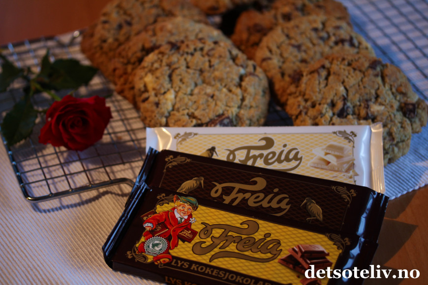 ♥ I disse cookiesene har jeg brukt tre favoritter fra Freia: Freia hvit sjokolade, Freia mørk kokesjokolade som heter Freia Selskapssjokolade og Freia lys kokesjokolade.