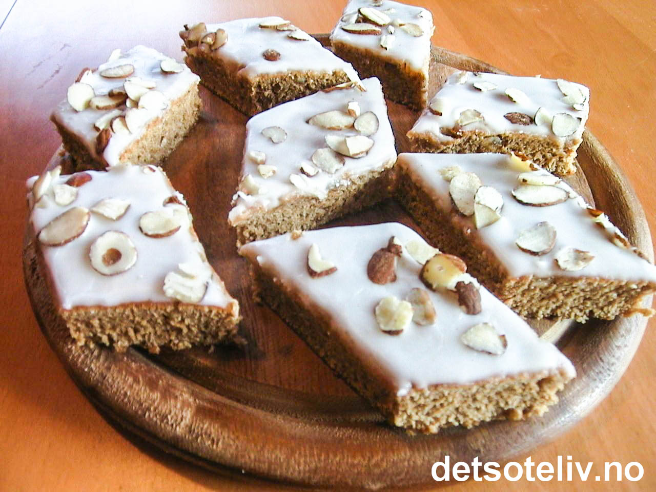 Rør sammen melisglasur og smør i et tynt lag over hele kaken. Dryss eventuelt over mandelflarn til pynt. Del kaken opp i snipper.