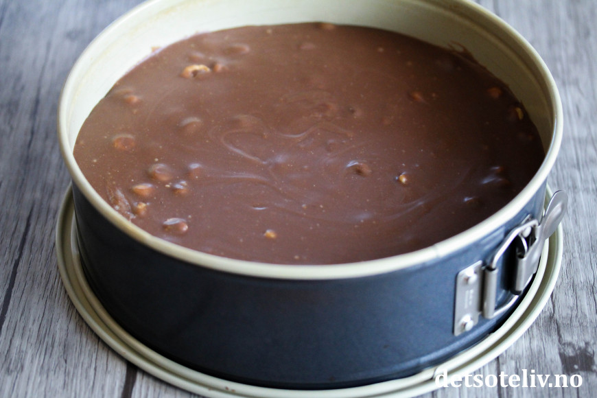 Fordel sjokoladekremen over mandelbunnen i formen. Sett formen i kjøleskapet i noen timer eller over natten (eller i fryseren, så går det fortere) til sjokoladekremen har stivnet.