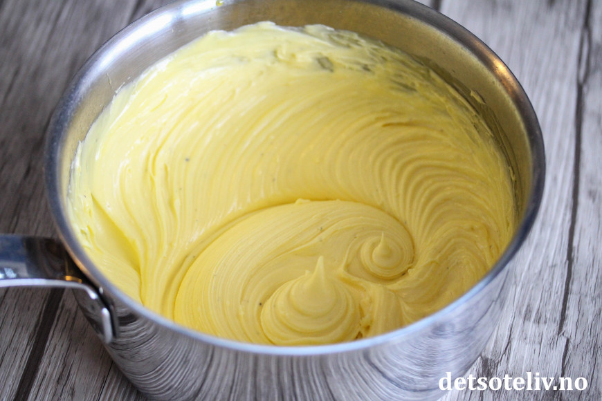 Sett kjelen i kjøleskapet til den gule kremen er helt kald og begynner å bli skikkelig tykk (gjerne over natten eller minst noen timer i kjøleskapet eller en stund i fryseren).