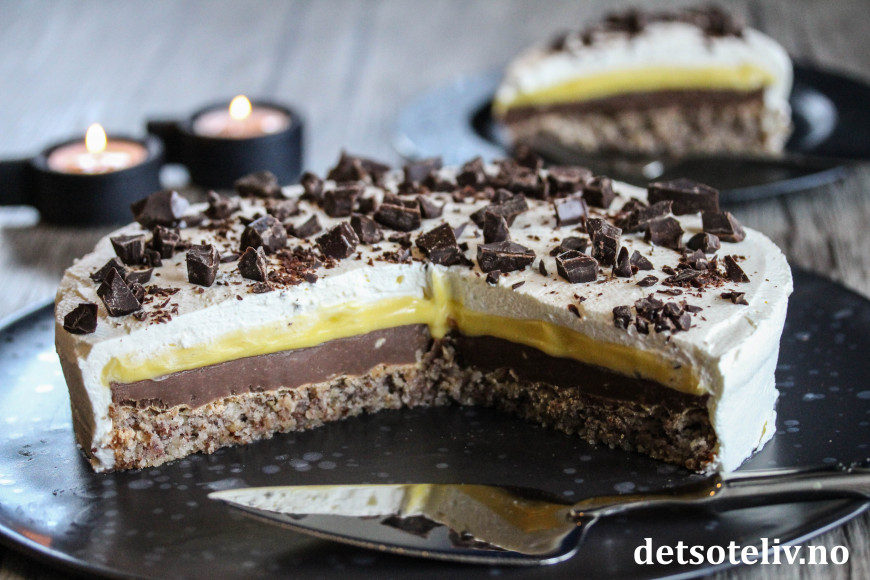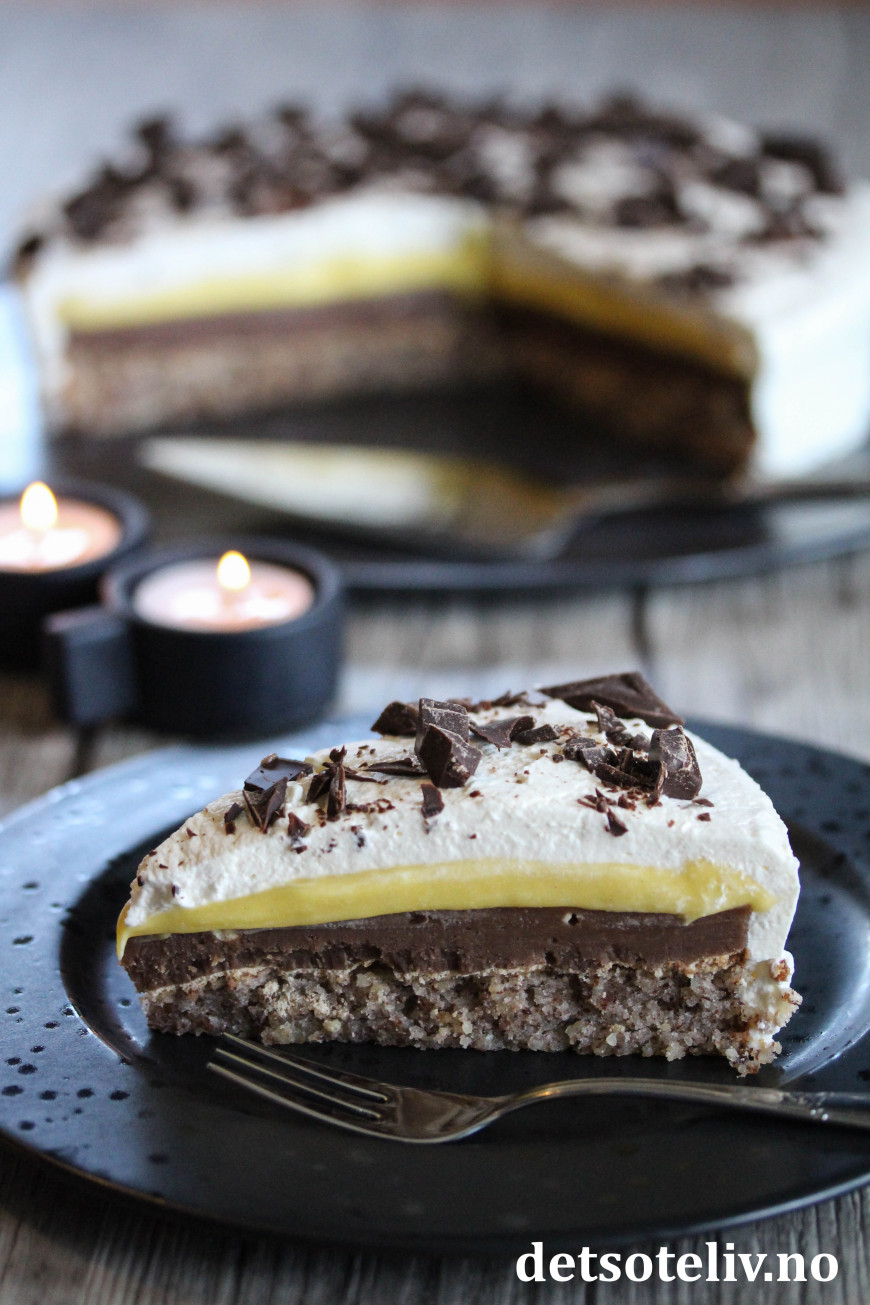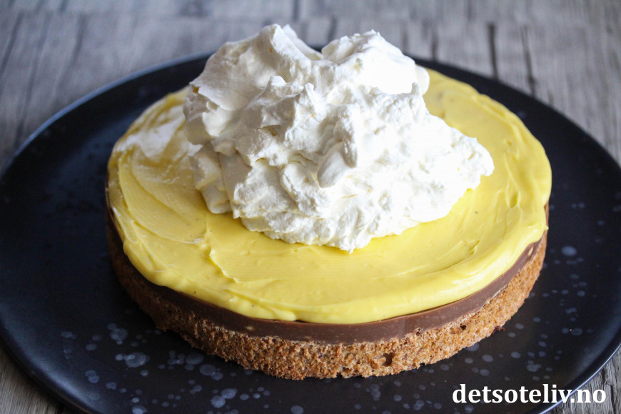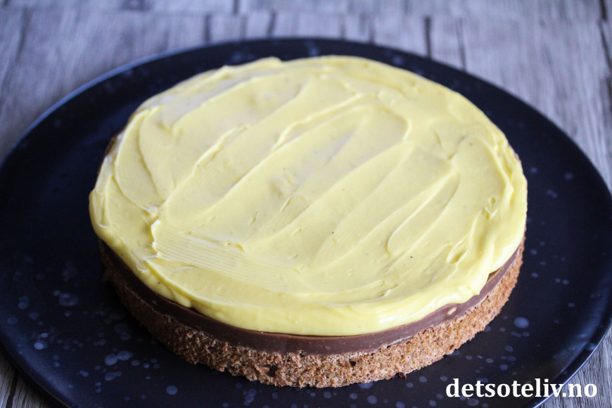 Sett kaken tilbake i kjøleskapet i noen timer slik at den gule kremen blir helt fast i konsistensen.