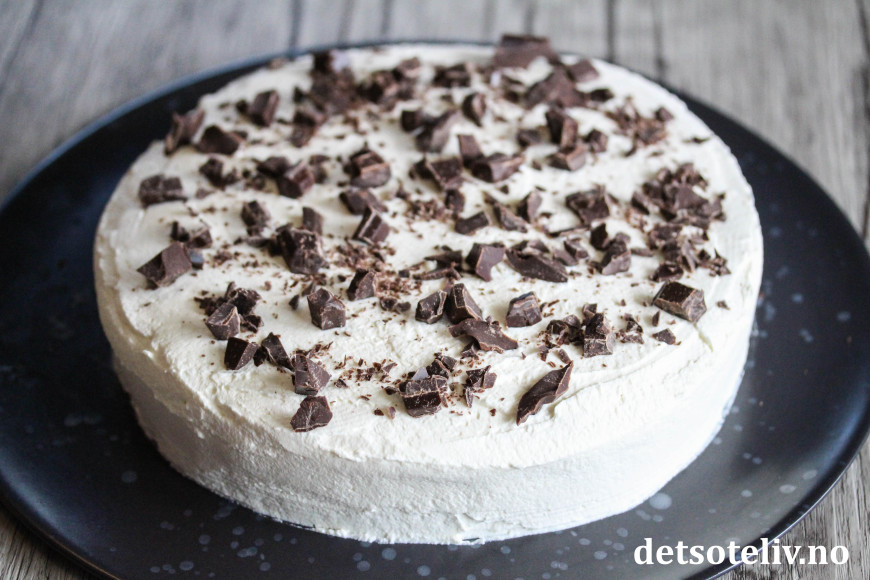 ♥ Kaken bør serveres samme dag som den pyntes med krem og hakket sjokolade.