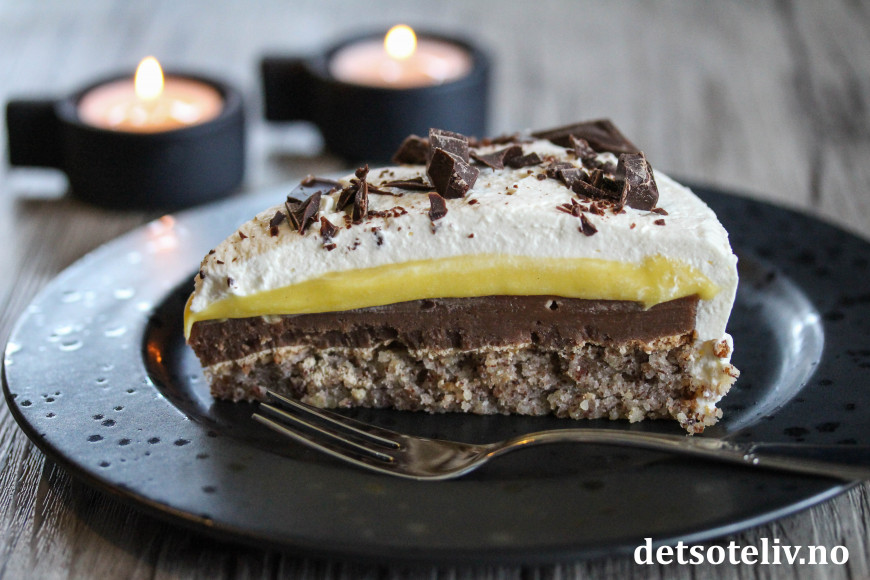 Trippelkremkake er veldig populær her på Det søte liv, og består av mandelbunn som dekkes av tre lag med deilige kremer: Ett lag firkløverkrem, ett lag suksesskrem og så ett lag fløtekrem.