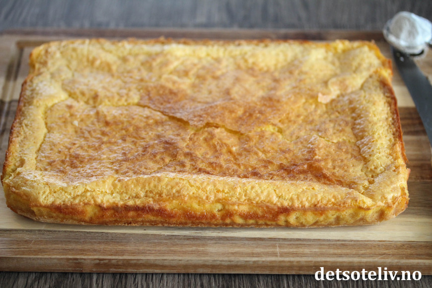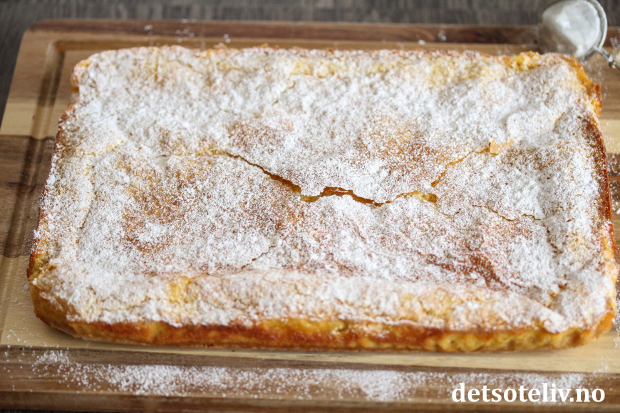 Dagen etter løftes kaken ut av langpannen og deles i små firkanter. Sikt over melis før servering.