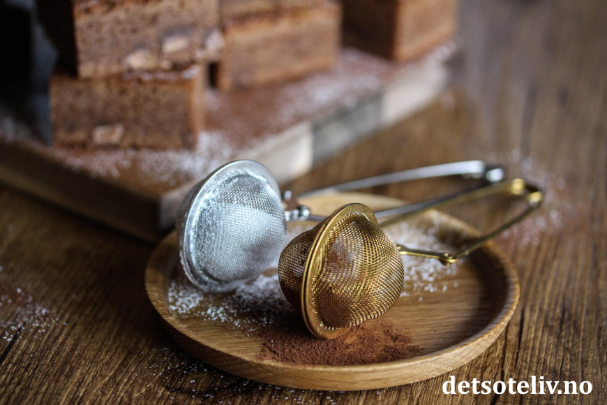 Løft kaken ut av formen og del den i firkanter. Gi kakestykkene et lett dryss av melis og kakaopulver før servering.