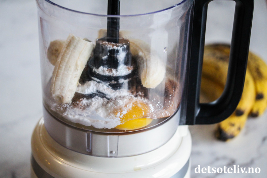 Visp sammen egg, moste bananer, vaniljesukker, bakepulver og kanel. Jeg bruker food processor, men du kan også mose bananene med en gaffel og blande med resten.