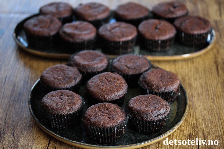 Stek muffinsene midt i ovnen ved 200°C i ca. 15 minutter (sjekk med kakenål at kakene er gjennomstekte).