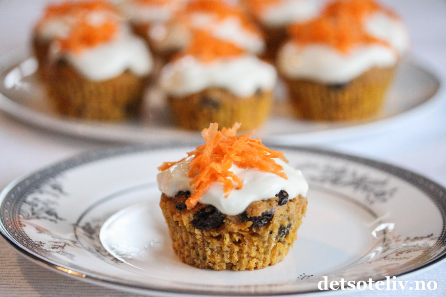♥ Disse gulrotmuffinsene smaker aller best samme dag de er laget. De kan fryses uten glasur.