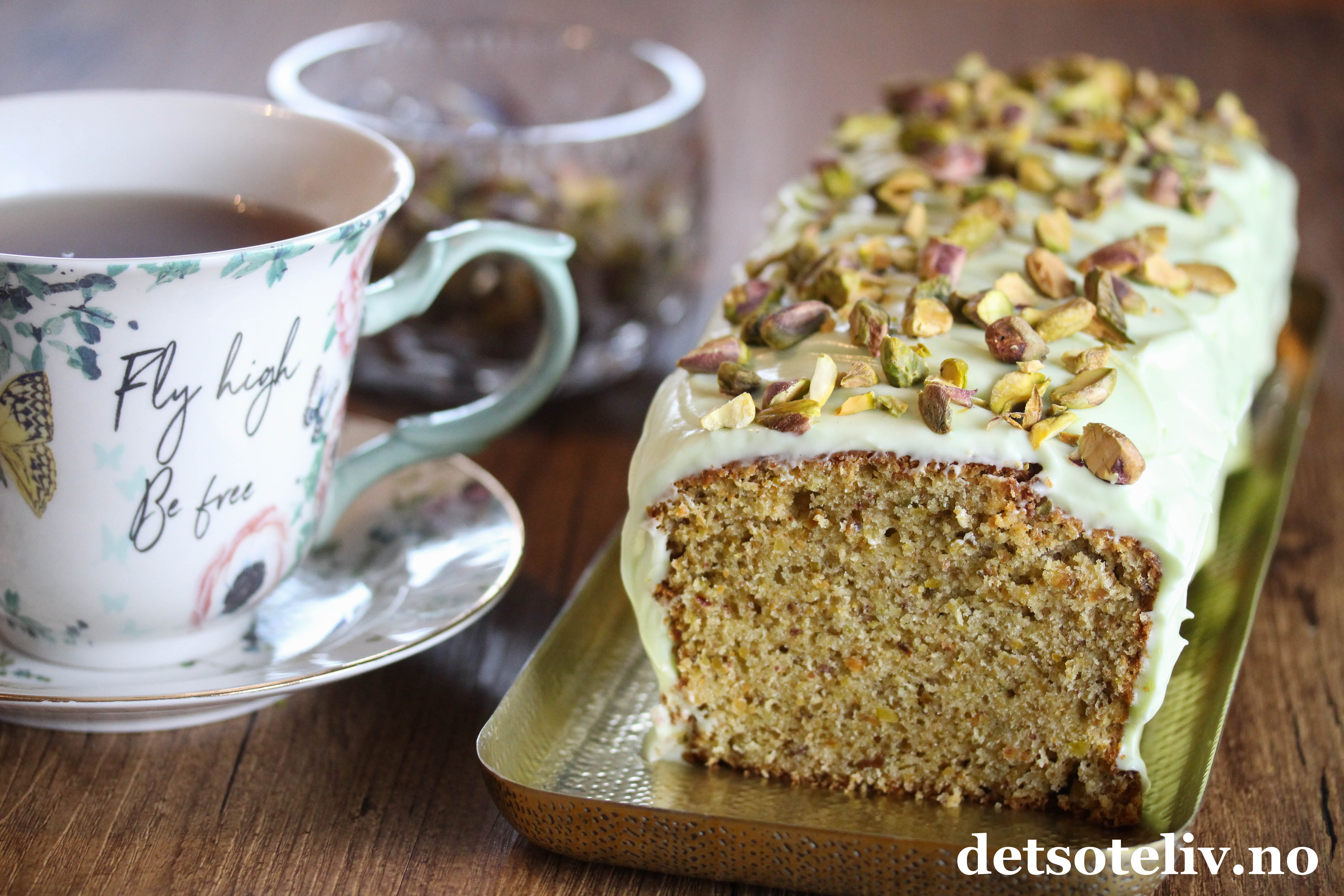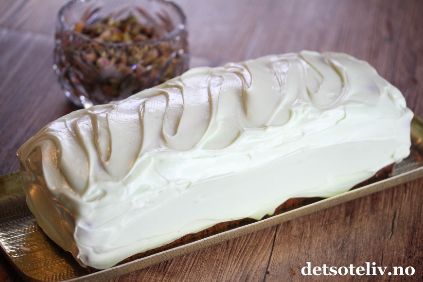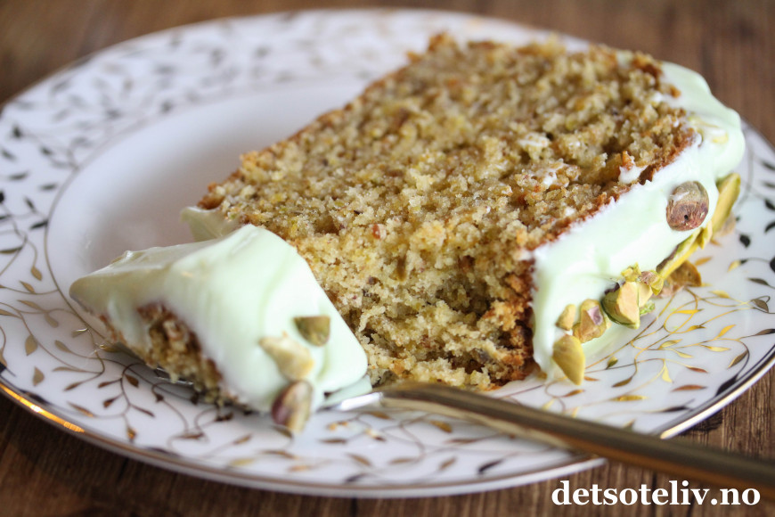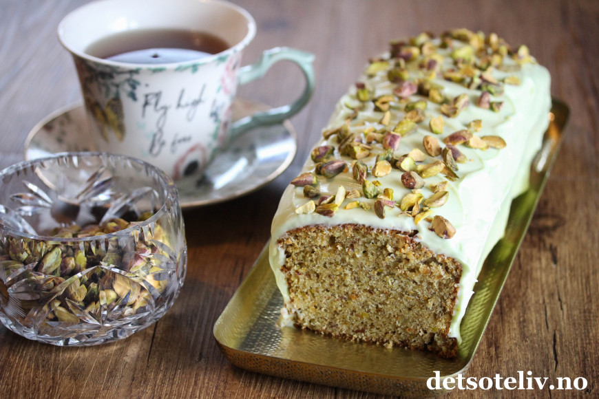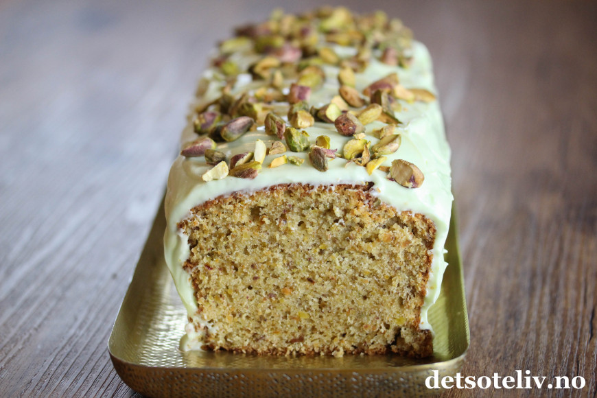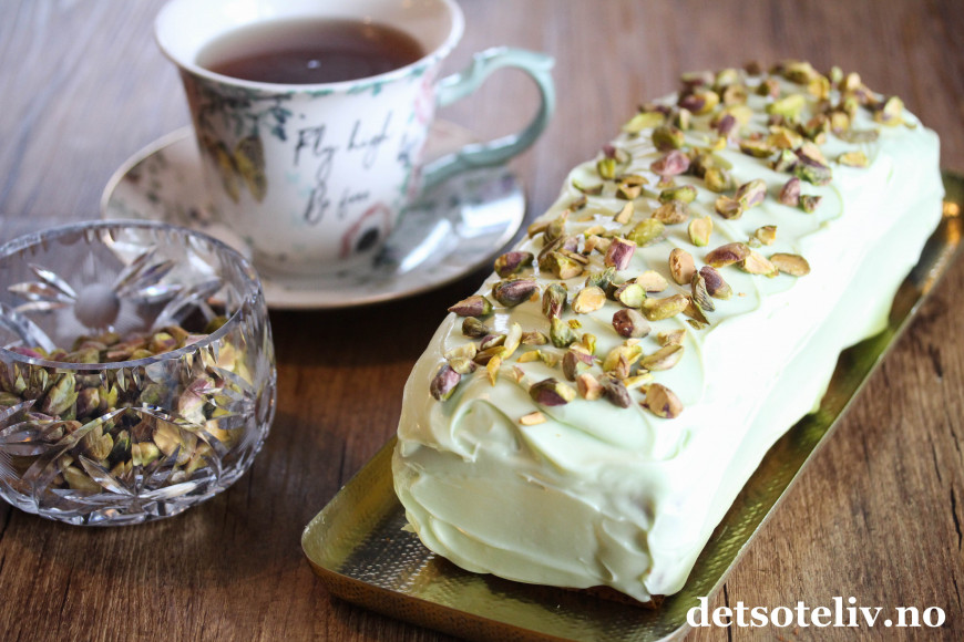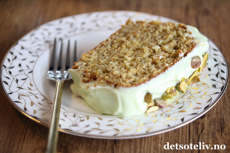 Dagens kake er en saftig formkake med pistasjnøtter. Jeg er veldig glad i pistasjnøtter og her har jeg komponert en saftig formkake med disse gode nøttene med utgangspunkt i en vaniljesauskake. Vaniljesaus i kakerøren gir en deilig vaniljesmak, som passer kjempegodt sammen med pistasjnøttene. På toppen av kaken har jeg brukt en ostekrem som jeg har farget svakt lysegrønt og dryss av grovt hakkede pistasjnøtter.