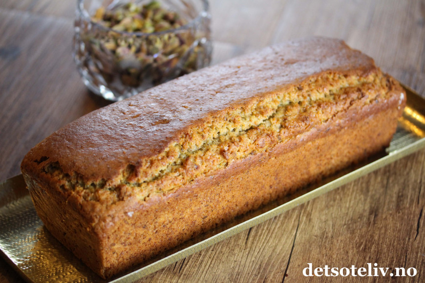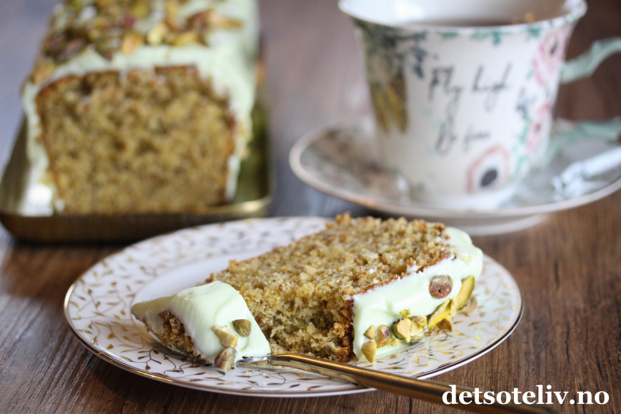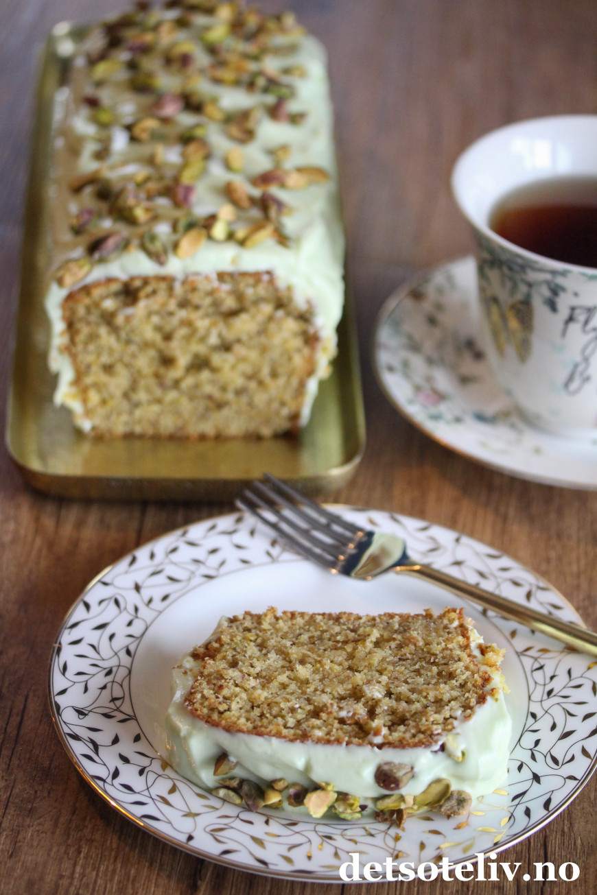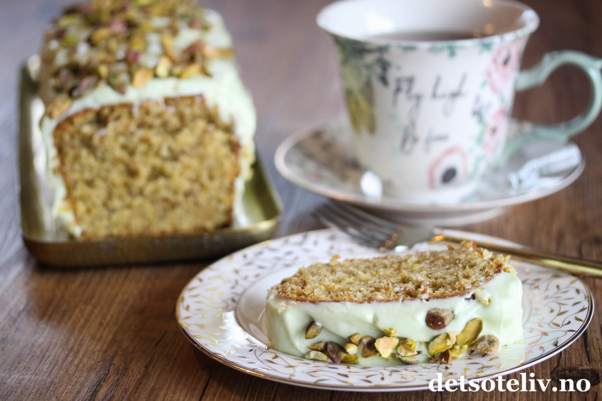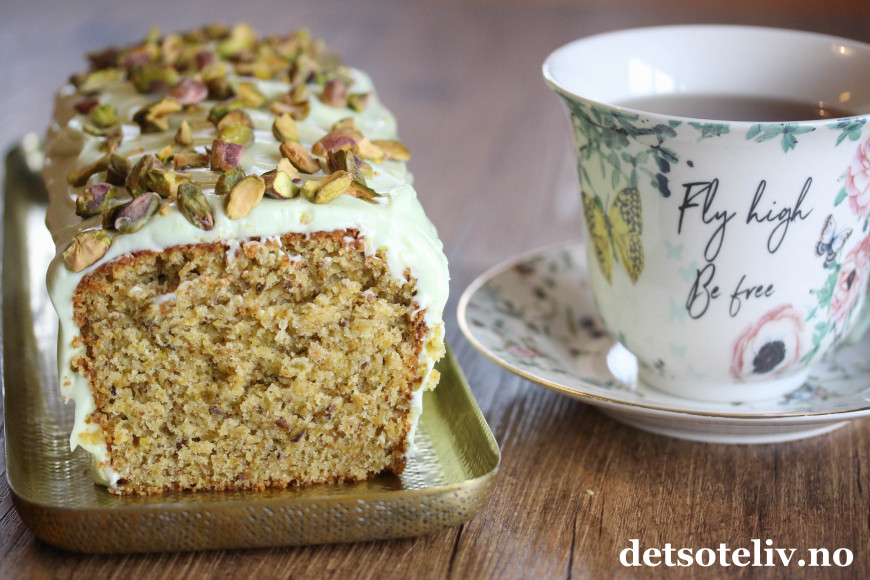 Dagens kake er en saftig formkake med pistasjnøtter. Jeg er veldig glad i pistasjnøtter og her har jeg komponert en saftig formkake med disse gode nøttene med utgangspunkt i en vaniljesauskake. Vaniljesaus i kakerøren gir en deilig vaniljesmak, som passer kjempegodt sammen med pistasjnøttene. På toppen av kaken har jeg brukt en ostekrem som jeg har farget svakt lysegrønt og dryss av grovt hakkede pistasjnøtter.