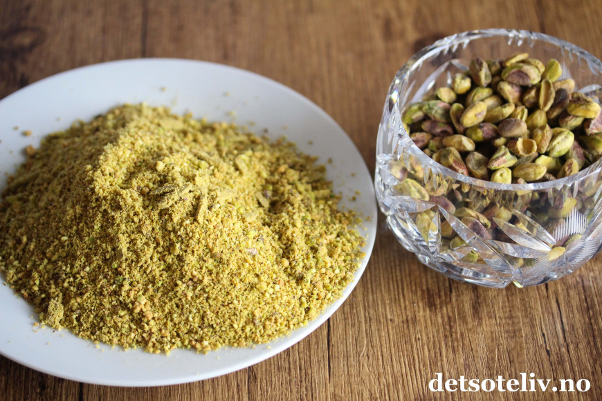 Sikt sammen vaniljesukker, bakepulver og hvetemel. Hakk pistasjnøttene fint i en food processor.