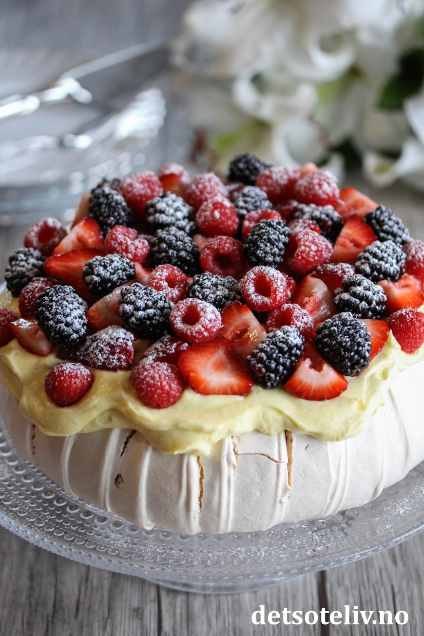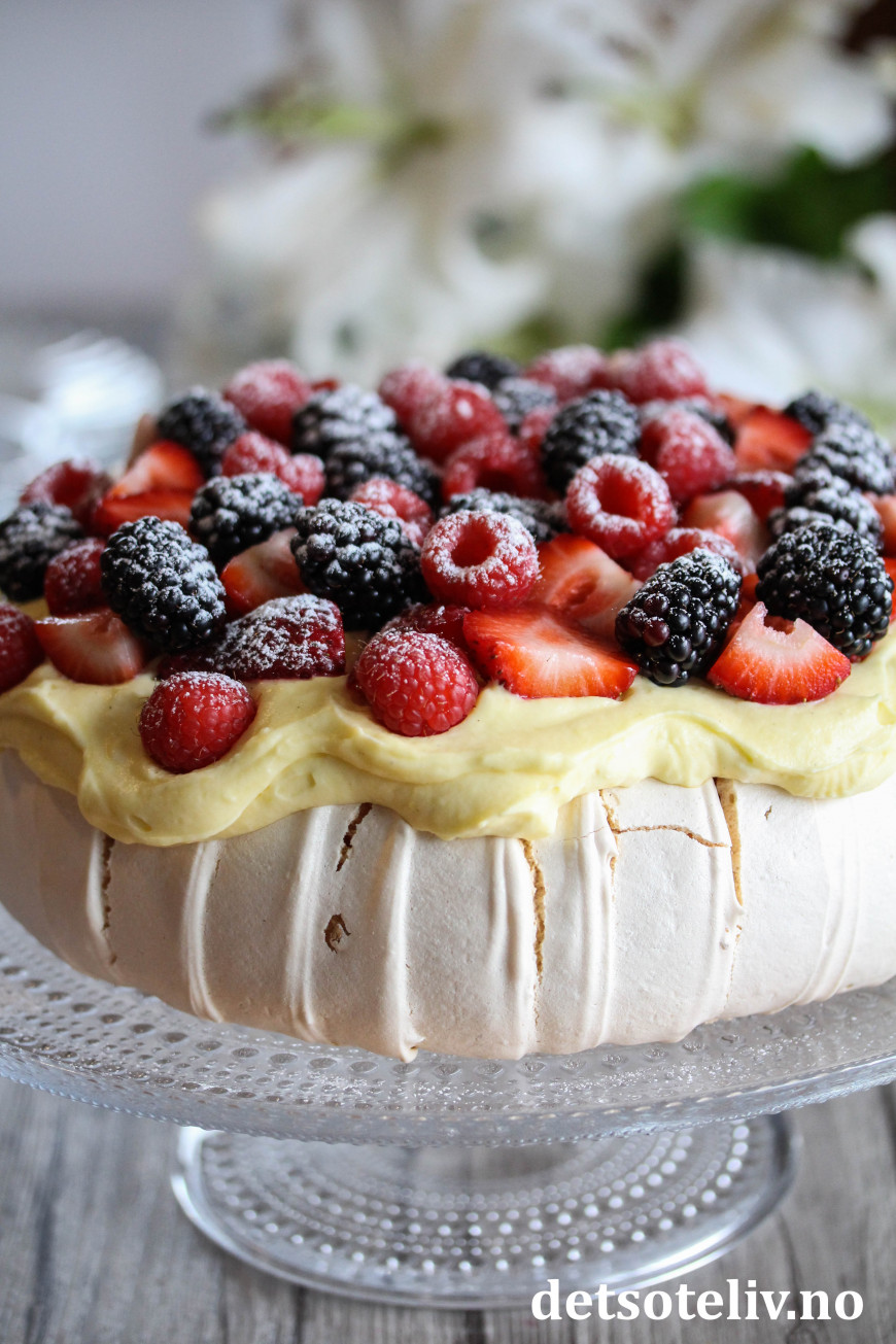 Husk at en Pavlova skal være høy og majestetisk, og bugne av bær!
