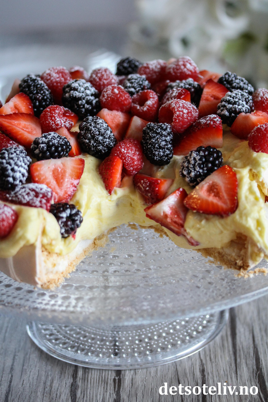 ♥ Kaken bør serveres samme dag som den pyntes med pisket krem og bær.