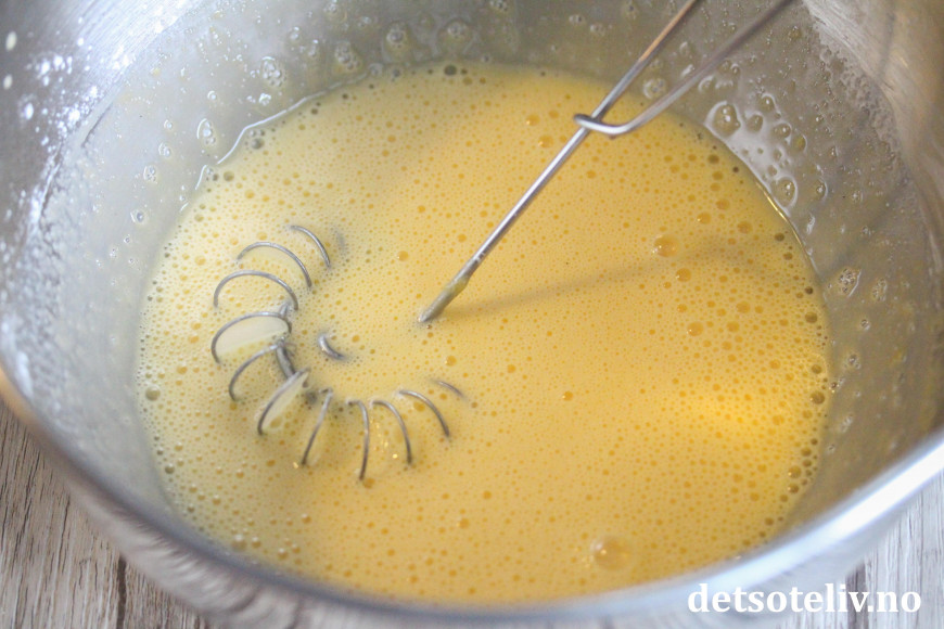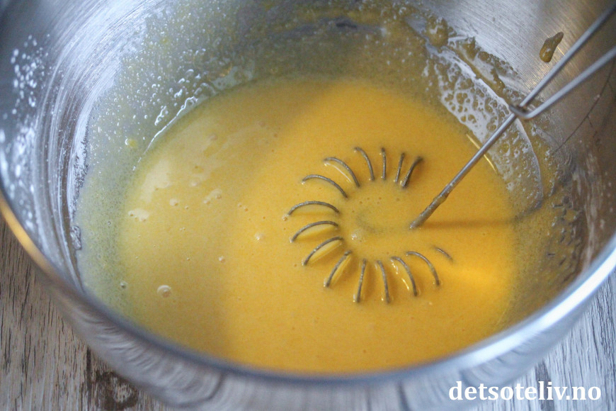 I en bolle piskes eggeplommer, sukker og maisenna lett sammen.
