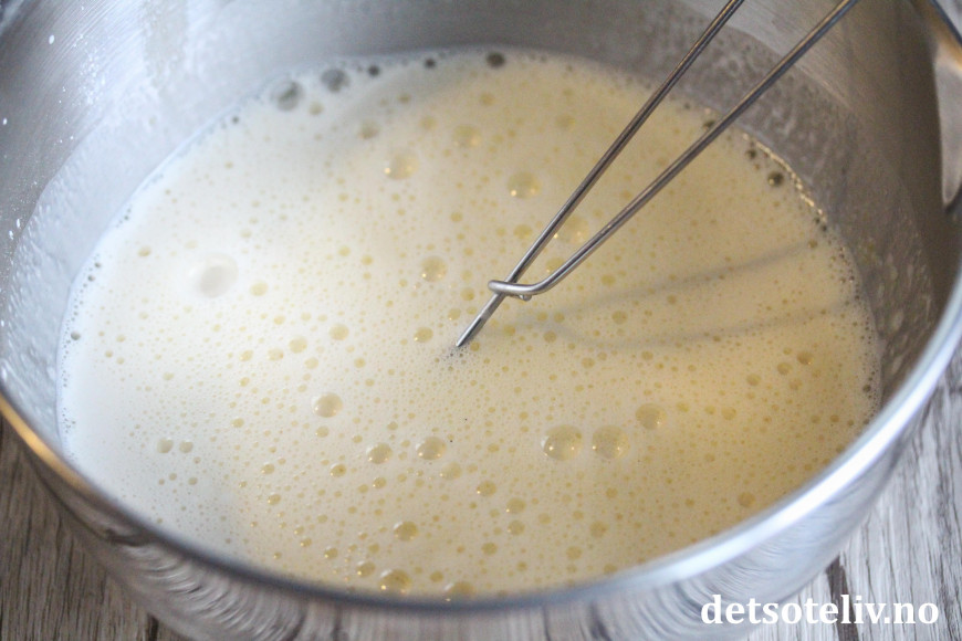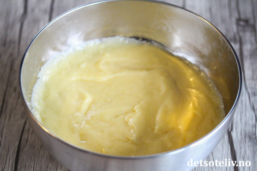 Ha den varme vaniljefløten litt og litt i eggeblandingen.