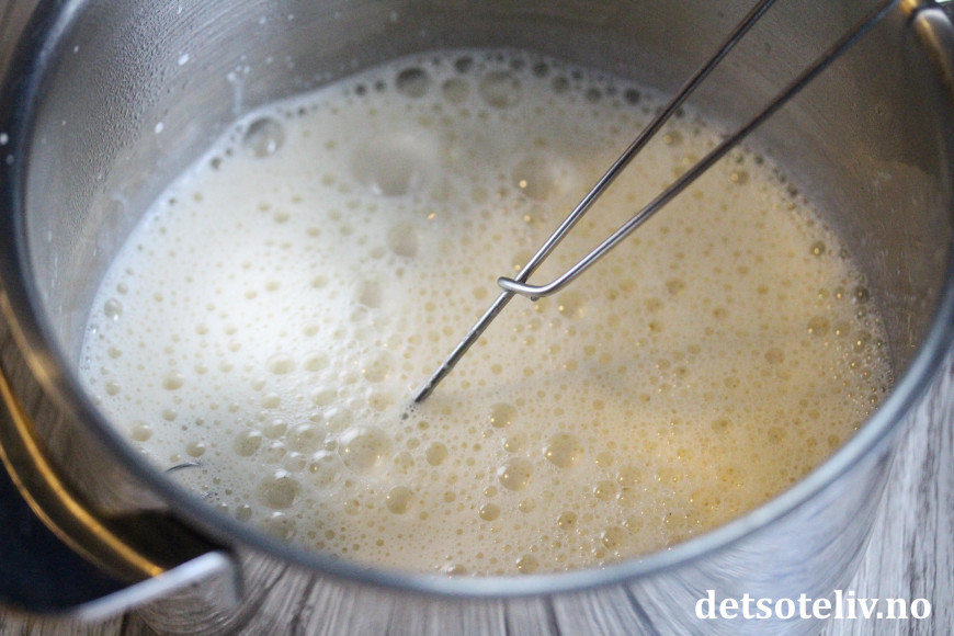 Varm opp på nytt under stadig omrøring, men nå er det veldig viktig at kremen ikke koker for da kan den skille seg. Vaniljekremen tykner etter hvert som den blir varm.