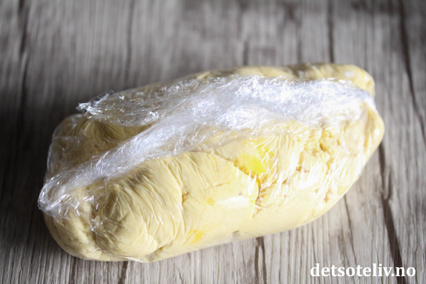 Avkjøl deigen innpakket i plast (den er nokså bløt i konsistensen, men blir fastere ved avkjøling).