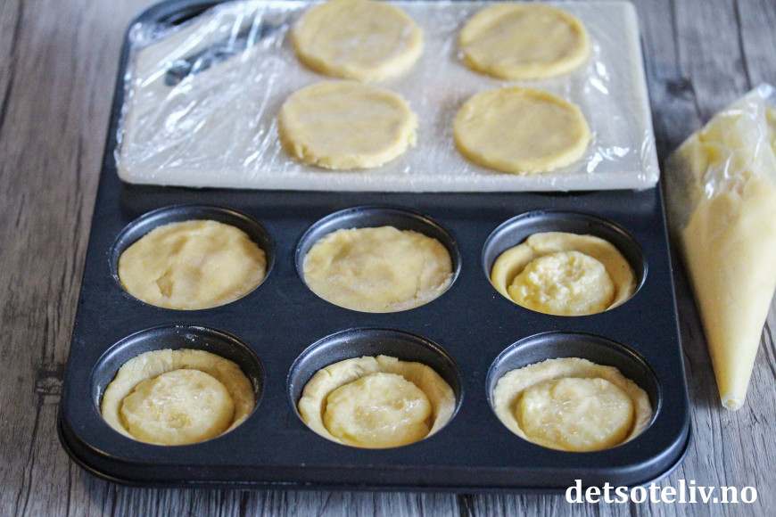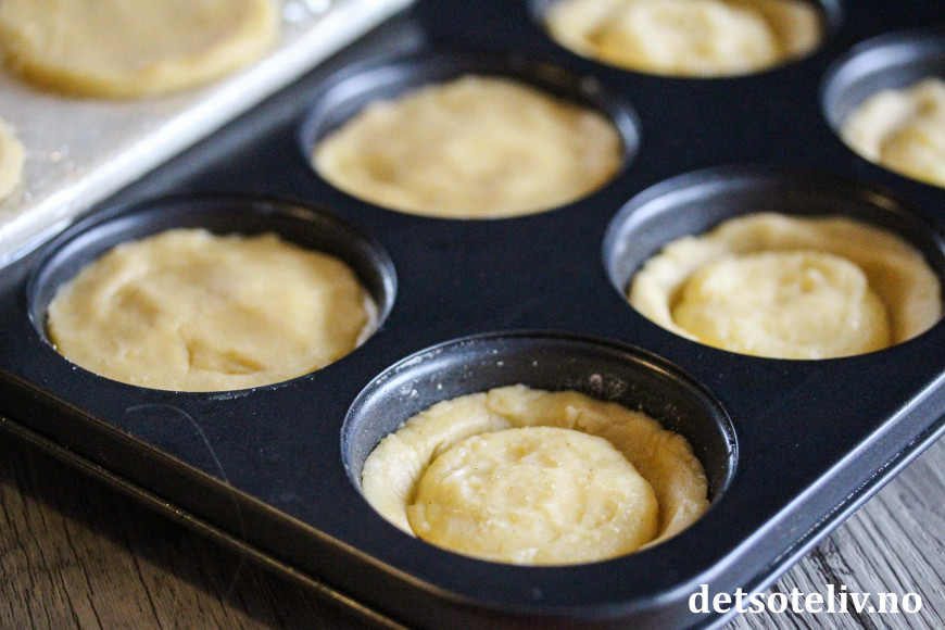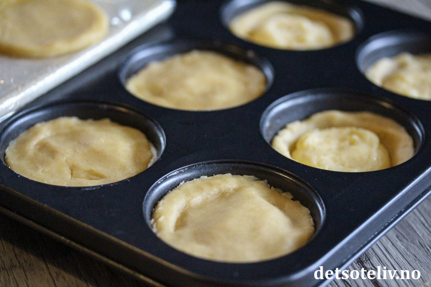 Kjevle ut resten av deigen og stikk ut runde lokk. Legg lokkene på formene og klem til i kantene.