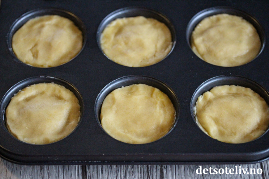 Bruk ca 2/3 av deigen til å trykke ut i formene med fingrene (se tips).