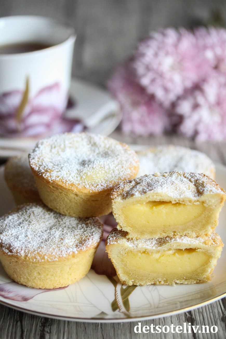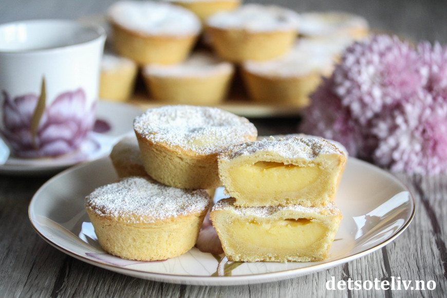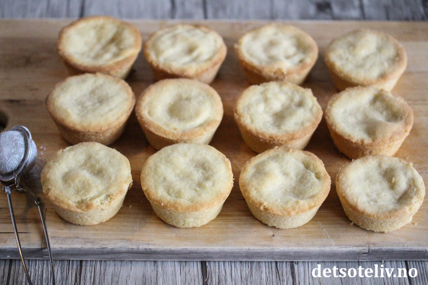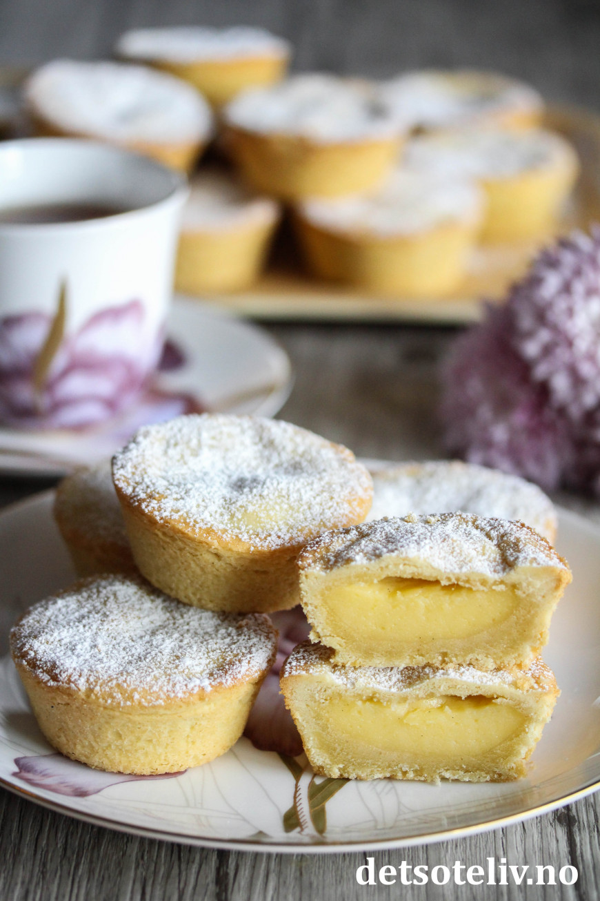 Mørdeigskakene er fylt med vaniljekrem og smaker nydelig!