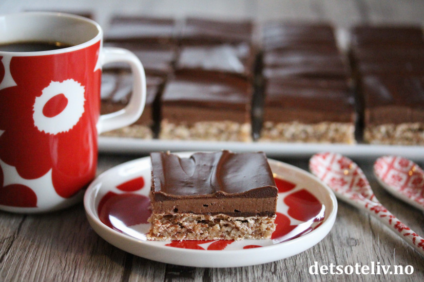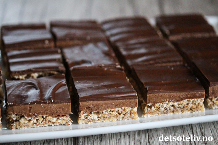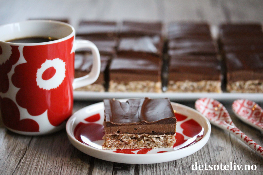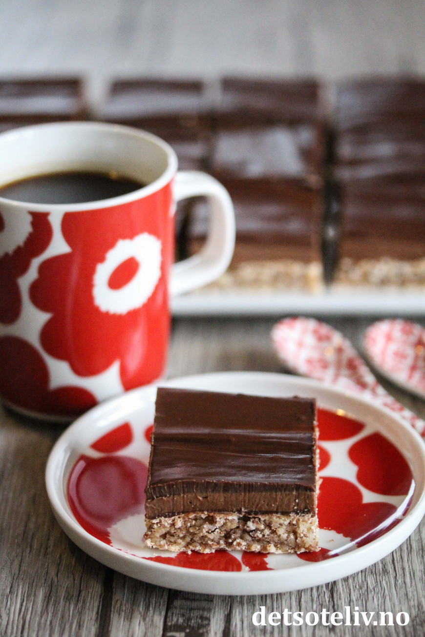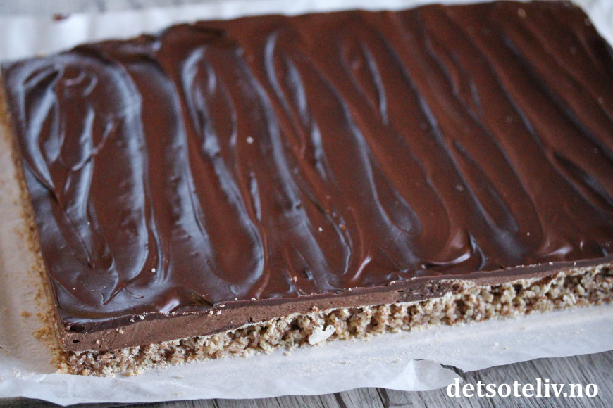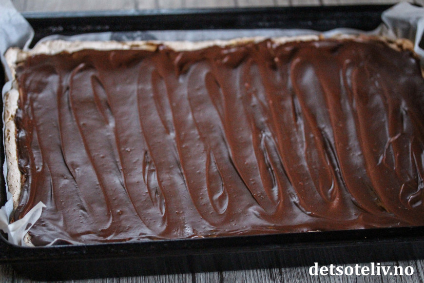♥ Mandelbunnen må være helt kald når du smører på sjokoladekremen, ellers vil den smelte inn i kaken. Det er også viktig at kaken med sjokoladekremen er helt kald når du smører på sjokoladeglasuren. Jeg satte langpannen i et kjølerom i et par timer. Det går også an å sette kaken i kjøleskap (hvis du får plass) eller 1 time i fryseren.