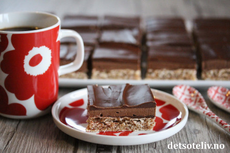 Del kaken opp i firkanter med en skarp kniv. Løft kakestykkene ut av langpannen med en stekespade.