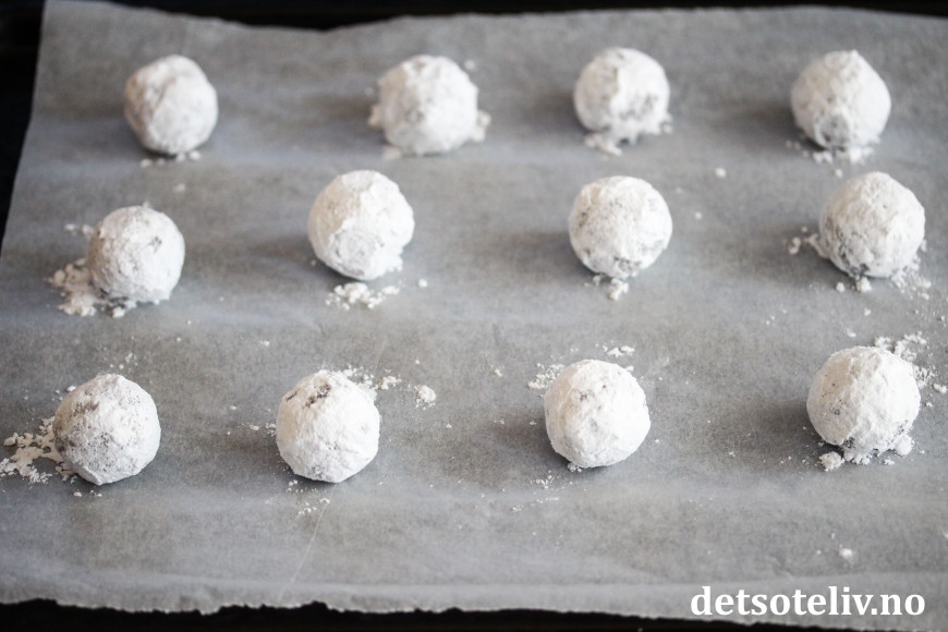 ♥ Deigen blir temmelig bløt og må derfor ligge i kjøleskapet helst over natten for å bli fast nok til at den kan trilles ut. Av samme grunn bør du ta bare litt og litt deig ut av kjøleskapet av gangen når du triller ut kulene, så ikke deigen blir liggende for lenge i romtemperatur og blir bløt igjen.