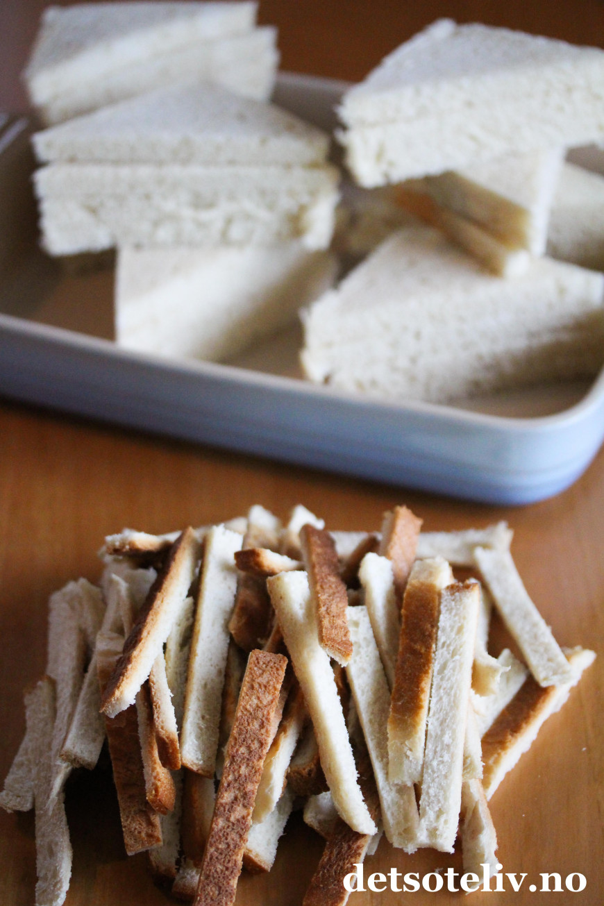 Skjær skorpene av loffskivene og del loffskivene deretter på diagonalen så de får fasong som trekanter.