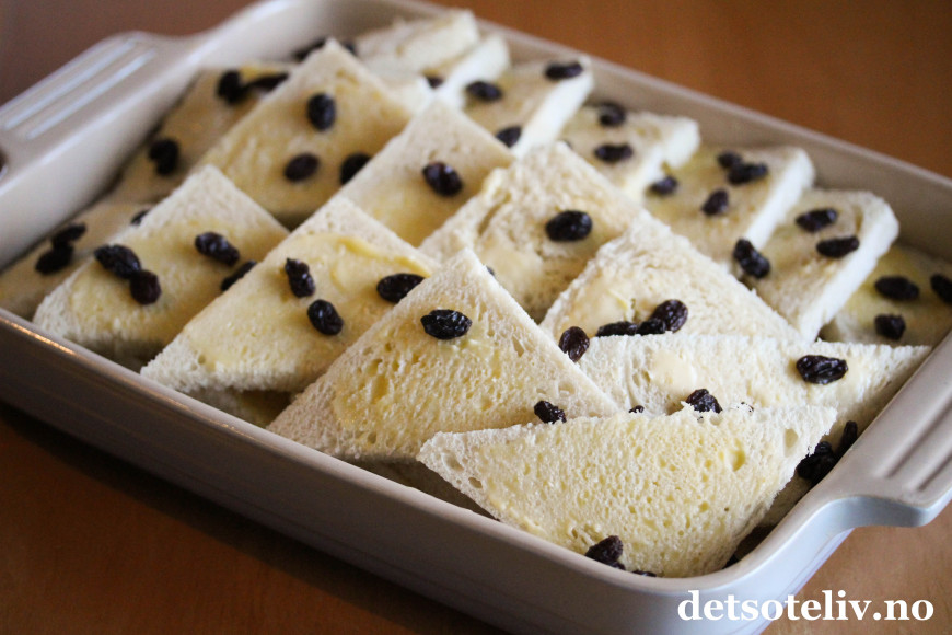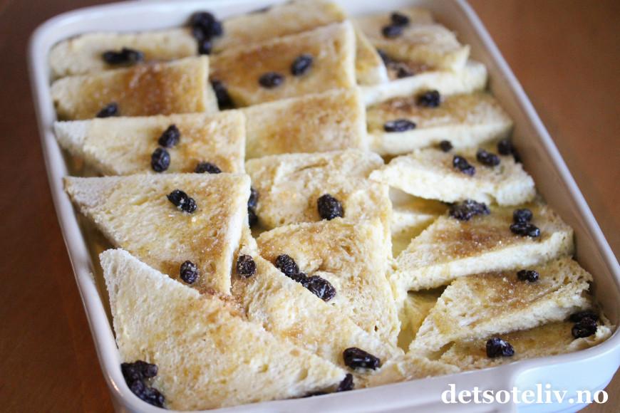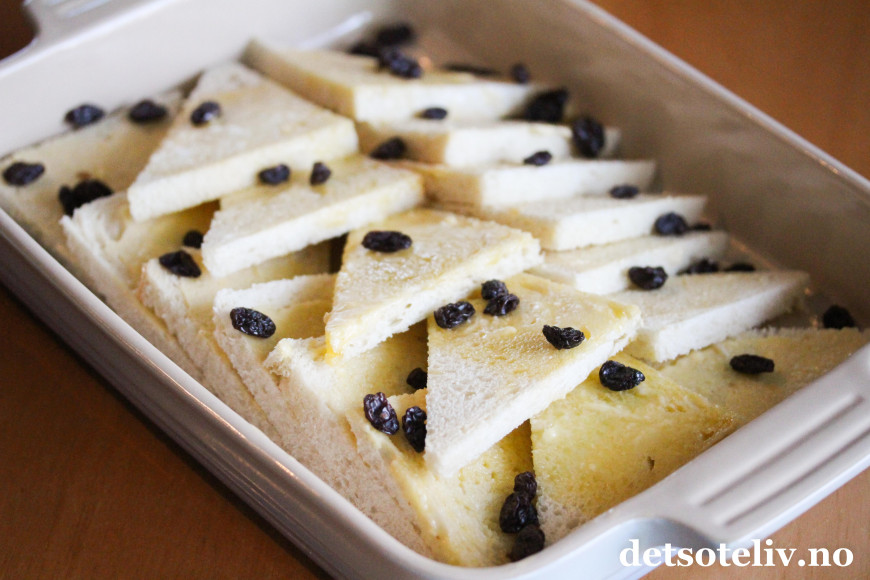 Smør loffskivene med smør. Legg loffskivene lett overlappende i en ildfast form (ca. 20 x 30 cm). Dryss over rosiner.