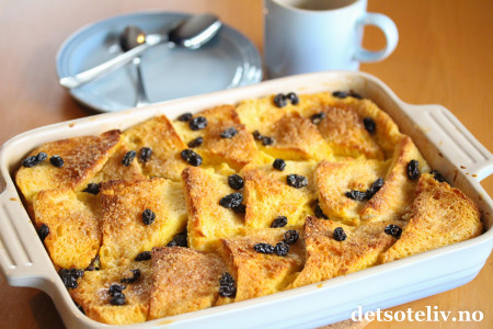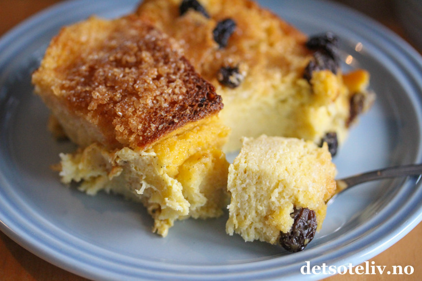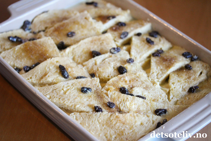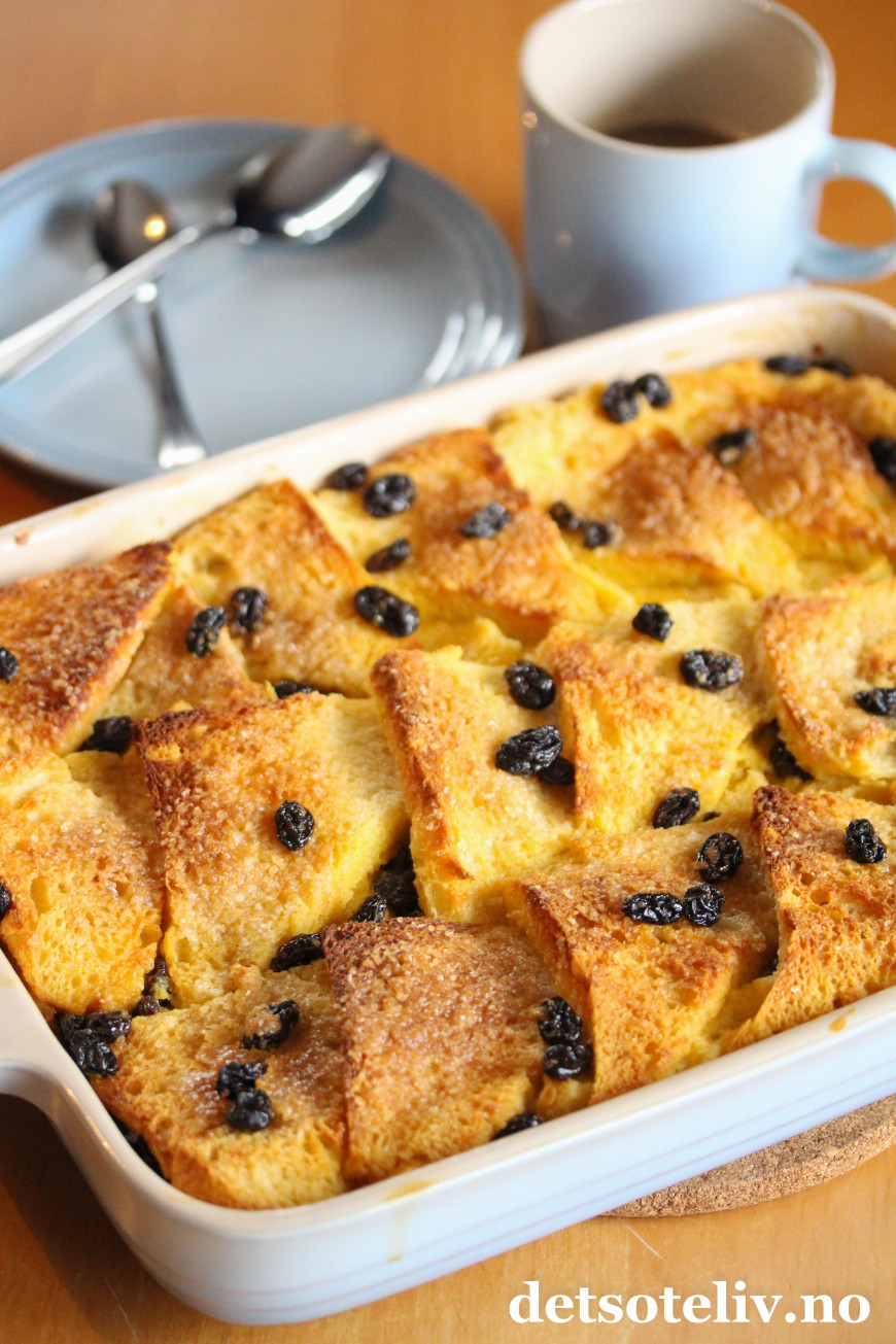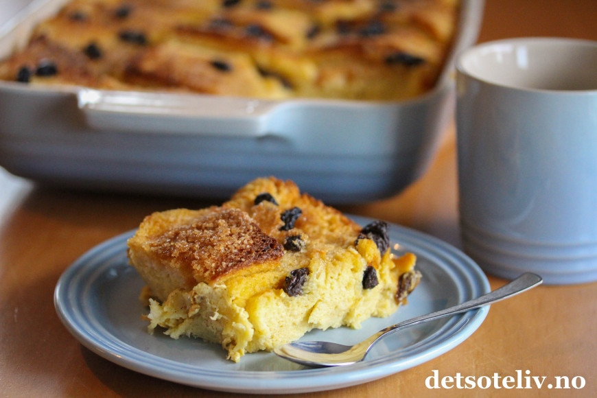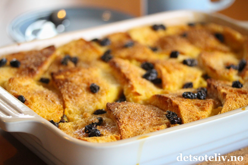 Stek brødpuddingen midt i ovnen ved 180°C i 35-40 minutter.