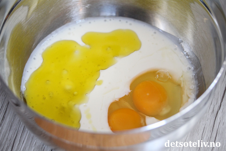 Ha kefir (eller kulturmelk), olivenolje (eller smeltet smør) og egg i en bolle. Visp dette lett sammen.