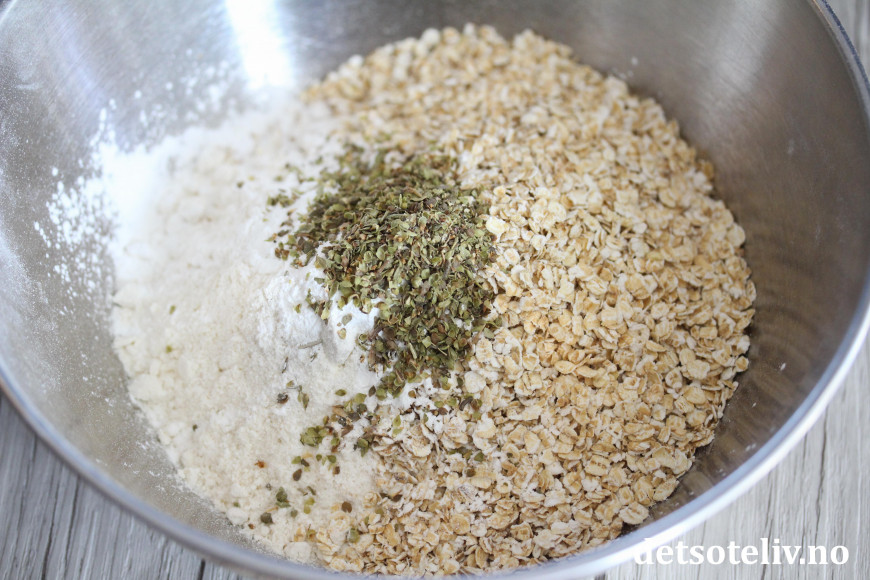 I en annen bolle blandes hvetemel, fint sammalt hvetemel, havregryn, bakepulver og oregano.